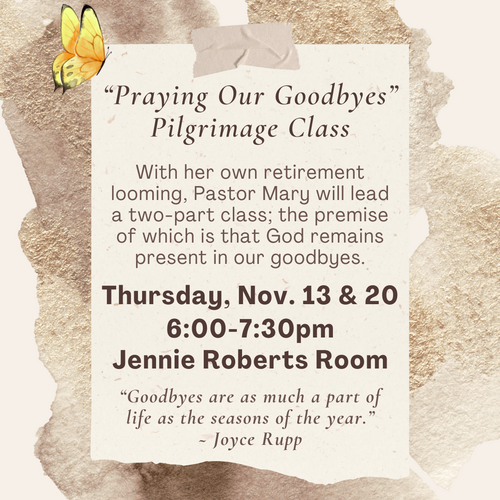 Pastor Mary will lead a two-part class on “Praying our Goodbyes” as she approaches retirement. This class will explore the significance of goodbyes throughout life, emphasizing God's presence during these transitions. Classes will be held on Thursdays, November 13 and 20, from 6:00-7:30 PM. Sponsored by the Pilgrimage Program, all are welcome.