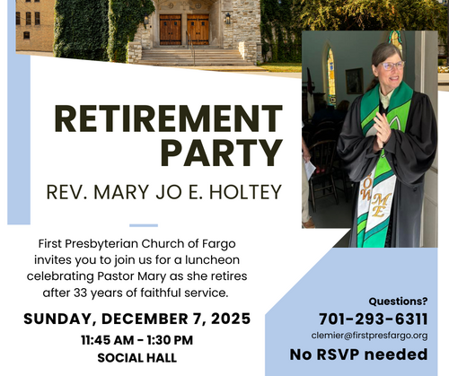 First Presbyterian Church of Fargo invites you to join us for a luncheon celebrating Pastor Mary as she retires after 33 years of faithful service. The celebration runs from November 23 to December 28, 2025. Even if you cannot attend the lunch, come any Sunday to congratulate Mary.