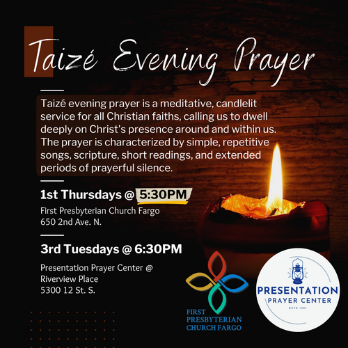 The next Taizé evening prayer service will be at 5:30pm on Thursday, November 6, in the Jennie Roberts Room. This special, meditative service, rooted in scripture, singing, and prayerful silence, is sponsored by the Presentation Prayer Center, who hold their own Taizé prayer service at Riverview Place on the 3rd Tuesday of each month, also at 6:30pm.