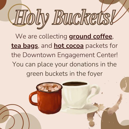 Holy Buckets is collecting small jars for Hope Blooms. They will accept pint-sized clear mason jars between 8-16 oz and clean recycled food jars similar to 8-16 oz mason jars. They are unable to accept assorted glass vases and containers for flowers. If you would like to donate, please put items in the green buckets in the West foyer.