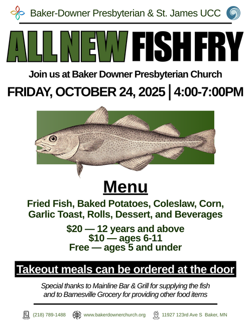 Join us at Baker Downer Presbyterian Church Friday, Oct. 24 from 4pm-7pm for an All New Fish Fry! Menu includes fried fish, baked potatoes, coleslaw, corn, garlic toast, rolls, dessert, and beverages. $20 for those 12 and older, $10 for 6-11, and 5 and younger eat free! Takeout meals can be ordered at the door. Special thanks to Mainline Bar & Grill for supplying the fish and to Barnesville Grocery for providing other food items! Sponsored by St. James UCC and Baker Downer Presbyterian Church.