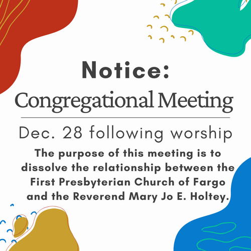 A Congregational Meeting has been called for Sunday, December 28, following Worship in the Sanctuary for the purpose of dissolving the relationship between the First Presbyterian Church of Fargo and the Reverend Mary Jo E. Holtey.