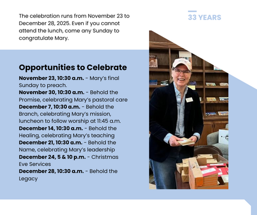 First Presbyterian Church of Fargo invites you to join us for a luncheon celebrating Pastor Mary as she retires after 33 years of faithful service. The celebration runs from November 23 to December 28, 2025. Even if you cannot attend the lunch, come any Sunday to congratulate Mary.